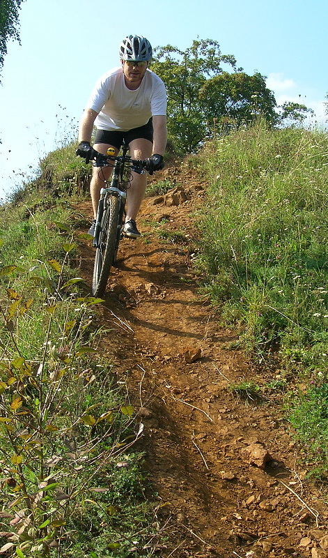 I tak sobie Roch myśli, że chyba pora pokazać jak to się naprawdę jeździ na rowerze, bo przecież po płaskim to z nudów umrzeć można, a jak wiadomo za dawnych czasów – niesłusznie minionych – Roch nie stronił od zjazdów co jest udokumentowane na fotografii. Sucha Góra zawsze Roch pociągała.